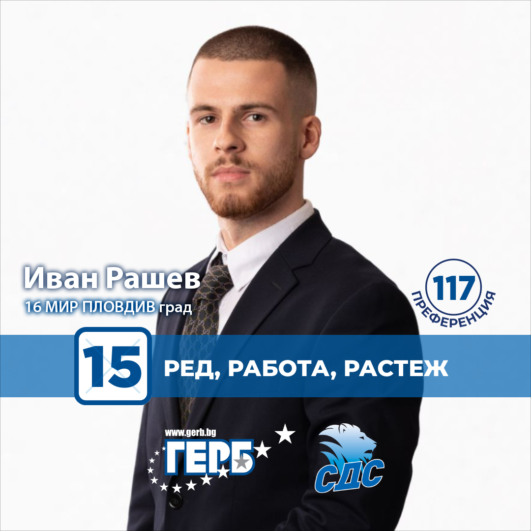 34 Иван Рашев е 17-и в листата на коалиция ГЕРБ-СДС в 16-ти МИР Пловдив-град за предстоящите избори на 19 април. Той е възпитаник на Хуманитарната гимназия „Св. св. Кирил и Методий“ в Пловдив, а в момента е студент трета година по право. Млад, амбициозен и ангажиран с обществените процеси, Рашев съчетава академичното си развитие с активен интерес към политиката и каузите, които вълнуват обществото. „Вярвам, че ГЕРБ е правилният избор, защото предлага стабилност, предвидимост и ясна посока за развитие на България в един динамичен свят. Като студент по право съм наясно, че редът, работата и растежът неминуемо вървят ръка за ръка“, заяви Иван Рашев. Той е категоричен, че младите хора трябва да бъдат активна част от обществения и политическия живот. Иван Рашев подчертава, че една от основните му мотивации е да допринася за създаването на повече възможности за развитие на младите хора в България, така че те да избират да останат и да се реализират в страната. „ГЕРБ работи за конкретни резултати – модерна инфраструктура, по-добри условия за образование, подкрепа за бизнеса и сигурна икономическа среда. Това са факторите, които дават реален шанс на младите да планират бъдещето си тук“, посочи той. Освен с образованието и обществената си ангажираност, Иван Рашев се отличава и с активен начин на живот. Той обича спорта и редовно играе волейбол, което според него изгражда дисциплина, екипен дух и постоянство – качества, които са важни както в личния живот, така и в политиката. В свободното си време предпочита да е със семейството и приятелите си, а също така е и ценител на качественото кино, от което черпи вдъхновение и различни гледни точки към света. Иван Рашев подчерта значението на предстоящия вот. „Гласът за ГЕРБ-СДС е глас за опит, отговорност и устойчиво развитие. Убеден съм, че България има потенциал да върви напред уверено и да бъде силна европейска държава, когато има стабилно управление и ясни приоритети“, категоричен е Иван Рашев, 17-и в листата за Пловдив-град. На изборите на 19 април изберете №15 за ГЕРБ–СДС и преференция 117 за Иван Рашев! Може да ви хареса също ЦИК генерира хеш кода за машинния вот Румен Радев продължава със срещите с граждани, днес е в Кърджали, Момчилград и Крумовград Румен Радев: Нагледахме се на управленци, които не смеят да защитават националните ни интереси навън Йотова свиква срещи с министри заради кризата от Близкия изток