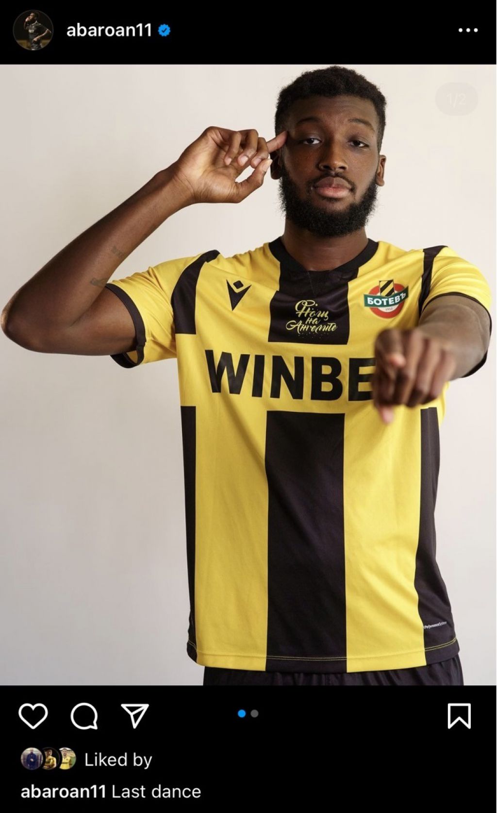 163 Интересна снимки качи в профила си в инстаграм нападателят на Ботев Антоан Бароан. Той позира с екипа на жълто черните, а коментарът към снимката гласи „последен танц“.Дали Бароан напуска Ботев … Предстои да разберем в следващите дни.Припомняме че той на няколко пъти бе ваден от отбора. По времето на Станислав Генчев Бароан не игра, а след това бе реабилитиран. Може да ви хареса също Ботев към бившия си капитан: Благодарим ти, Попе! Попето обяви края на своята кариера Антоан Конте записа мач №50 с екипа на Ботев Пловдив Славия и Ботев (Пловдив) търсят завръщане на победния път