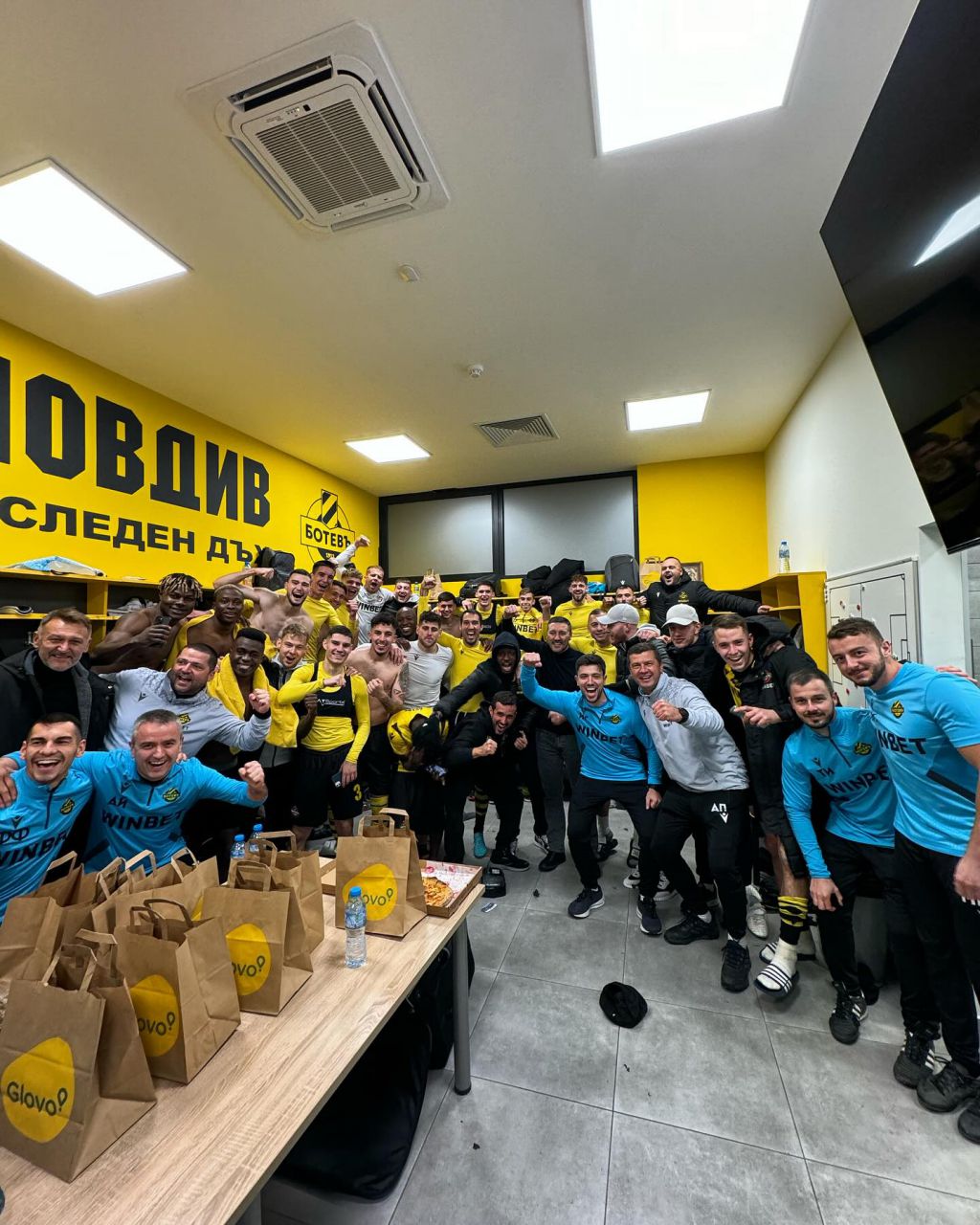 163 Играчите и спортният щаб на Ботев се снимаха в съблекалнята след 8- мия пореден успешен мач на жълто- черните. От утре отборът е в заслужена почивка, а Душан Керкез е предвидил първото занимание за новата година на 4 януари.Две седмици Ботев ще тренира в Пловдив, след което ще замине на лагер в Турция.Относно нови попълнения Керкез заяви, че през януари трудно се привличат качествени играчи, но все пак ще се търсят попълнения предвид очакваните изходящи трансфери. Може да ви хареса също Шалке 04 преговаря за бивш играч на Ботев Илиян Филипов: Да продължим да пишем историята със същата красота, вяра и борба, които ни определят вече повече от век. Да живее Ботев! Да живее Пловдив! Ботев (Пловдив) подкрепя предложението на Лудогорец за работна среща между клубовете, БФС и БПФЛ Ботев Пловдив е пример! Огромен интерес към кампанията От дете на дете!