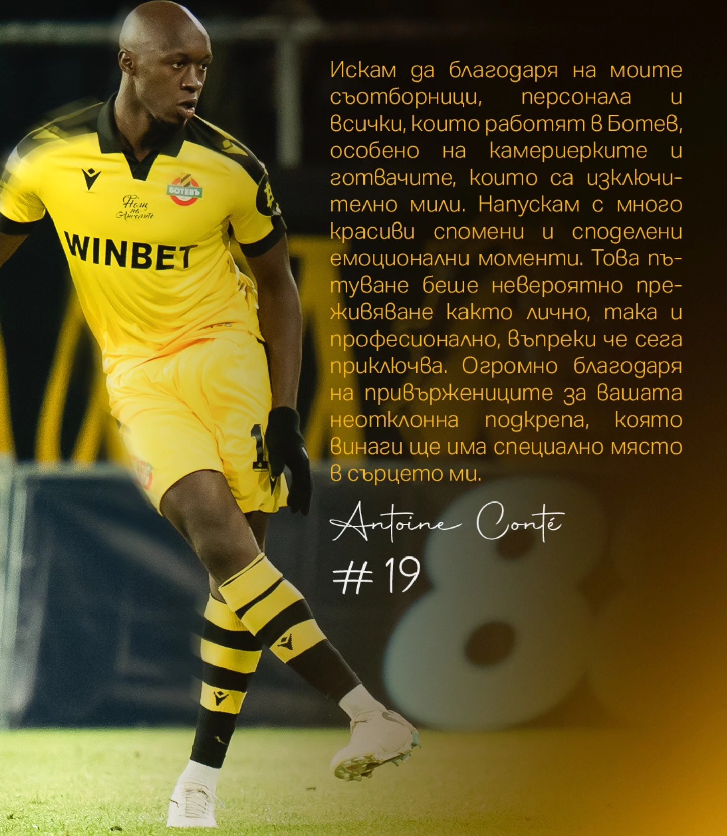 298 Бившият футболист на Ботев Пловдив Антоан Конте използва социалните платформи на клуба, за да се обърне към съотборниците си, щаба и всички „жълто-черни“ фенове. Защитникът не пропусна да благодари и специално на служителите и администрацията на „канарчетата“, с които изкара прекрасна година и половина под тепетата. Конте бе втори капитан на отбора. Той изигра 42 мача, 6 от които в Европа и спечели веднъж Купата на България с „жълто-черния“ екип. „Тръгвам си с много красиви спомени и емоционални моменти. Огромни благодарности към феновете за тяхната нестихваща подкрепа, която завинаги ще остане в сърцето ми“, споделя гвинейският бранител в посланието си изпратено до клуба. От Ботев също благодариха на Конте. Може да ви хареса също Марица и Спартак със зрелищно равенство Локо II допусна обрат от Левски в Карлово Христо Янев: Победихме Ботев с характер Херо: Трябва да търсим първо вината в себе си, но съдийството повлия