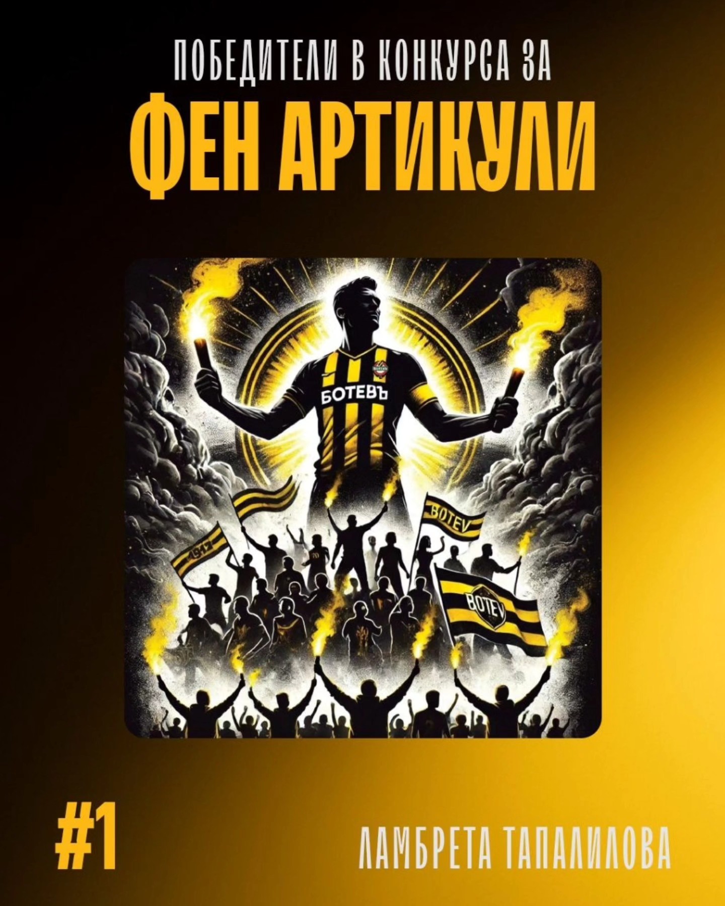 453 От Ботев представиха трите проекта, спечелили „жълто-черния“ вот след проведения конкурс за дизайн на клубни артикули: На първо място с 326 гласа е класиран проектът на Ламбрета Тапалилова. Второто място е за проекта на Емил Чолаков, за когото са дали своя вот 134 привърженици на Ботев. Третият проект, спечелил вашето одобрение е на Вакрил Маринов, за когото са гласували 129 човека. ПФК „Ботев“ ще се свърже с авторите на проектите, получили вашето одобрение, а на всички останали участници в конкурса благодарим за проявения интерес, като им пожелаваме много щастливи мигове с „жълто-черните“ през 2025 година! С уважение, Ръководството на ПФК „Ботев“ Може да ви хареса също Спортът мачовете по телевизията днес Расте интересът от чужбина към крилото на Ботев Армстронг Око-Флекс Марица взе гейм на полския шампион на старта на групите в Шампионската лига Ботев Пловдив ще предложи нов договор на Николай Минков