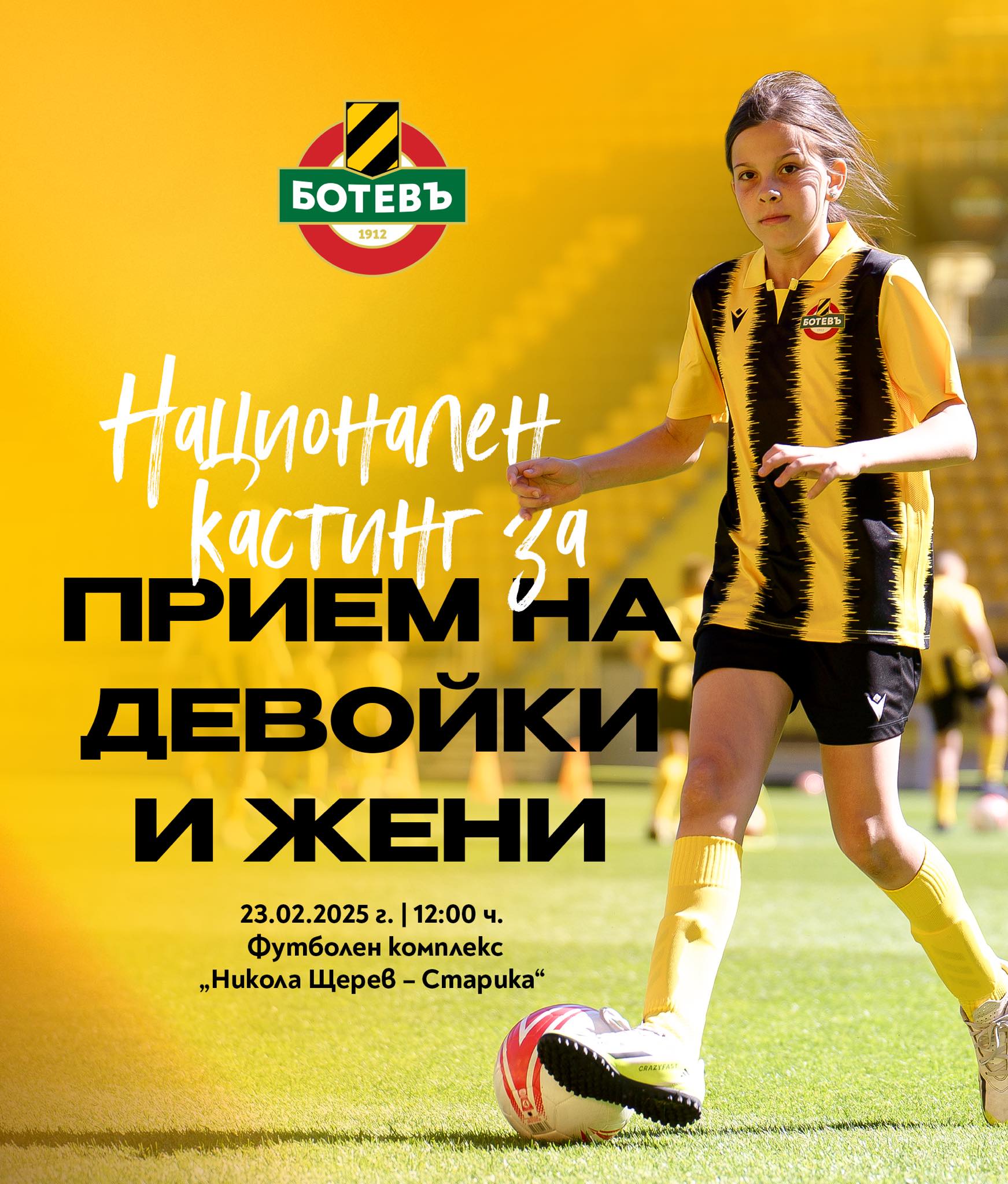 659 Ботев (Пловдив) организира национален кастинг за девойки родени от 2016г. до 2007г. и жени родени след 2006г. от цялата страна. Селекцията ще се проведе на 23.02.2025 г. (неделя) на футболен комплекс „Никола Щерев – Старика“ от 12:00 ч. Желаещите да постъпят в академията на Ботев ще направят серия упражнения, с които да бъдат проверени възможностите им. Всички участнички ще бъдат наблюдавани от треньори, скаути и директора на ДЮШ. Кандидатките трябва да са с подходяща футболна екипировка и футболни обувки тип стоножки. Необходимо е кандидатките да попълнят формуляр за регистрация, който може да бъде намерен в сайта ни. За допълнителна информация относно предстоящия национален кастинг – тел: 0892 62 62 30 Може да ви хареса също Йордан Иванов е новият треньор на Академик Бултекс 99 Карлос Насар с нови цели за 2026 година Ботев тренира двуразово, петима юноши се включиха при мъжете Хуан Переа и Лукас Риян се присъединиха към тренировките на Локо