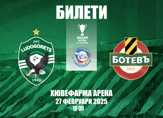515 ПФК Лудогорец съобщава на своите фенове, че вече са в продажба билетите за четвъртфинала от турнира за Купата на България с Ботев (Пловдив). Мачът ще се играе на 27 февруари (четвъртък ) от 18,00 ч. на стадион „Хювефарма Арена“ в Разград. Входни талони могат да се закупят на базата „Гнездо на орли“ от 10,00 ч. до 18,00 ч. В деня на мача ще работи билетната каса на улица „Васил Левски“ от 15,00 ч. до началото на срещата, а два часа преди началото на срещата ще рабоит и касата за гости на Сектор Г. Цените на билетите за двубоя с Ботев (Пловдив) са: Сектор В – блокове 1,2,5 и 6 – 12,00 лв. Сектор В – блокове 3 и 4 – 20 лв. Сектор Б (Моци ) – 10 лв. Сектор Г- 10 лв. Деца и пенсионери ползват 50% намаление. Лудогорец напомня, че от всеки продаден билет ще се отделят средства в подкрепа на сдружение “ Аз Вярвам и Помагам“ и техните каузи за децата на България. Може да ви хареса също Йордан Иванов е новият треньор на Академик Бултекс 99 Карлос Насар с нови цели за 2026 година Ботев тренира двуразово, петима юноши се включиха при мъжете Хуан Переа и Лукас Риян се присъединиха към тренировките на Локо