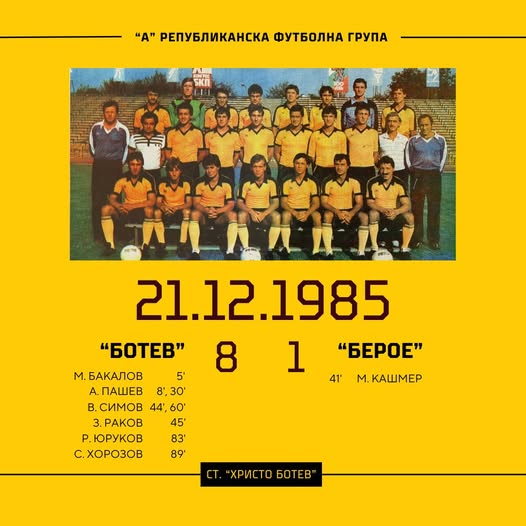 50 На днешния ден преди точно 40 години отборът на „Ботев“ разгромява „Берое“ с 8:1 в среща от 18-ия кръг на „А“ Републиканска футболна група, играна на стадион „Христо Ботев“ пред над 16 000 зрители. В края на сезона старозагорци стават шампион на България, но са отборът-шампион с най-голямата загуба в историята на елита на българския футбол. „Жълто-черните“ пък остават на второ място в крайното класиране, след като най-големият враг на „канарчетата“ – „Левски“, подарява победата в мача си с „Берое“, която е от решаващо значение за крайния развой на шампионата. „Канарчетата“ изиграват един от най-фантастичните си мачове в своята клубна история и буквално разцепват тима на „Берое“. През първото полувреме играта на моменти дори не излиза извън наказателното поле на гостите и положенията следват едно след друго. В безпомощността си „заралии“ правят откровени нарушения в наказателното си поле и дори не оспорват отсъдените дузпи, нещо, което след десетилетия те няма да признават в стремеж да омаловажат разгрома си. Без контузените титулярни нападатели Антим Пехливанов и Ивайло Стойнов, както и в отсъствието на наказания Костадин Костадинов, тимът на Иван Глухчев излиза само с един атакуващ футболист – Атанас Пашев. Защитата на „Берое“ прави грешка като насочва всичките си усилия по опазването му и така проспива нахлуванията на халфовата линия Бакалов-Георгиев-Зехтински-Симов. Още в 8-ата минута резултатът вече е 2:0 след голове на Марин Бакалов и Атанас Пашев от дузпа. В 30-ата минута Богдан Дочев отсъжда нов наказателен удар за „Тракия“ и Пашата е точен за 3:0. Мюмюн Кашмер връща едно попадение за „заралии“ в 41-вата минута. В 44-ата минута Васил Симов вкарва третата дузпа за домакините и веднага след това Запрян Раков прави резултата 5:1. През второто полувреме гостите получават още три попадения, дело на Васил Симов, Румен Юруков и Славчо Хорозов. СЪСТАВЪТ НА „БОТЕВ“: 1. Димитър Вичев (81`– Милан Каратанчев), 2. Трифон Пачев, 3. Димитър Младенов (70` – Славчо Хорозов), 4. Благой Блангев, 5. Запрян Раков, 6. Марин Бакалов, 7. Румен Юруков, 8. Васил Симов, 9. Георги Георгиев, 10. Петър Зехтински, 11. Атанас Пашев Може да ви хареса също Медиите от родината на Косич: Ботев е исторически по-разпознаваемият отбор в Пловдив Време е за финал – Марица среща Левски в преследване на 11-а Купа на България Лидерът Балкан победи Академик Бултекс 99 в Пловдив Спортна ТВ неделя