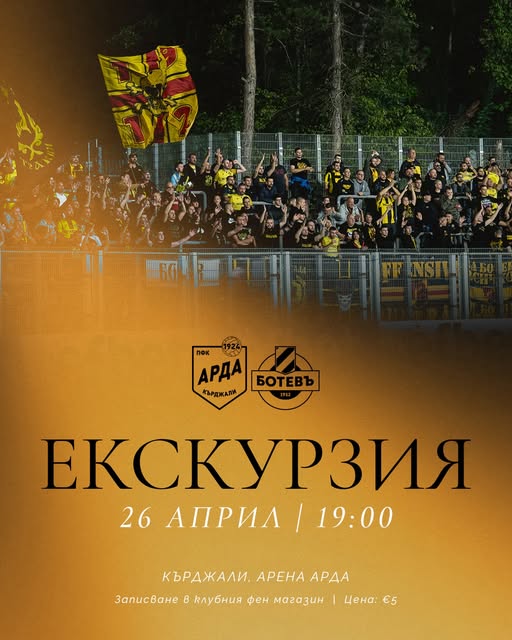 195 Ботев Пловдив организира екскурзия за феновете за гостуването на Арда. Записванията ще се осъществяват от днес в клубния фен магазин. Цената на екскурзията е 5 евро, като в нея не е включен билет за мача. В днешния ден магазинът ще бъде с работно време от 11:00 до 16:00 часа. Може да ви хареса също Кампанията „Ръка за ръка с Ботев“ продължава и на дербито с Локомотив Спортът и мачовете по телевизията днес Сериозен интерес от Италия към талант на Ботев Първи епизод от сблъсъка между Арда и Локомотив Пловдив