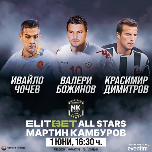 208 Представяме ви следващите три звезди, които ще вземат участие в бенефисния шоу мач на неповторимия Мартин Камбуров – голмайстор №1 в родния елит за всички времена с 256 попадения. Валери Божинов – отбор ALL STARS Bulgaria с треньор Александър Томаш Красимир Димитров – отбор ALL STARS Lokomotiv с треньор Христо Бонев Ивайло Чочев – отбор ALL STARS Bulgaria с треньор Александър Томаш Билети за шоу мача в сайта EVENTIM.bg , https://bit.ly/all-stars-kamburov , билетен център на EVENTIM пред сградата на Община Пловдив, информационен център „Старинен Пловдив“, бензиностанции OMV и книжарници Orange в цялата страна. Може да ви хареса също Ботев почете легендарния Георги Велинов Ботев с информация за феновете за мача със Септември Тодор Киров свири на Ботев, Стоян Арсов на Локо Без право на грешка – Лудогорец излиза за задължителен успех срещу Локо (Пд)