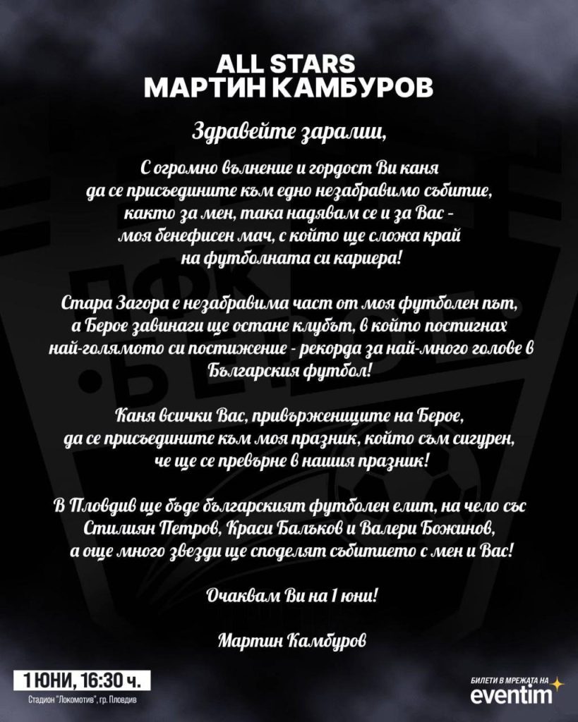 162 „Бенефисният шоу мач на Мартин Камбуров е над клубните пристрастия. Днес официално каним всички привърженици на Берое да присъстват на стадион „Локомотив“ на 1 юни, за да изпратим заедно легендата на българския футбол“, това написаха на официалната страница на събитието по повод бенефиса на Мартин Камбуров. Камбуров постигна рекорда за най-много голове в Българския елит, именно в тима на „заралии“. Там той остави своята следа, като негова фланелка с номер 256 и до днес краси музея на Берое. Мартин Камбуров кани официално всички запалянковци на Берое с емоционално писмо: За привържениците на Берое ще има организиран транспорт за двубоя до Пловдив и обратно до Стара Загора. Билети за шоу мача ELITBET All Stars Мартин Камбуров в сайта EVENTIM.bg, билетен център на EVENTIM в Стара Загора, бензиностанции OMV, книжарници Orange в цялата страна, Фенклуб на Берое на ул. Захари Княжески 81А (зад съда) всеки работен ден от 12:00 до 19:16 часа. Може да ви хареса също Без право на грешка – Лудогорец излиза за задължителен успех срещу Локо (Пд) Напусна ни големият Джони Велинов Пламна ресторант в Сандански, евакуираха 200 малки футболисти от хотела Марица доближава върха след победа в Димитровград