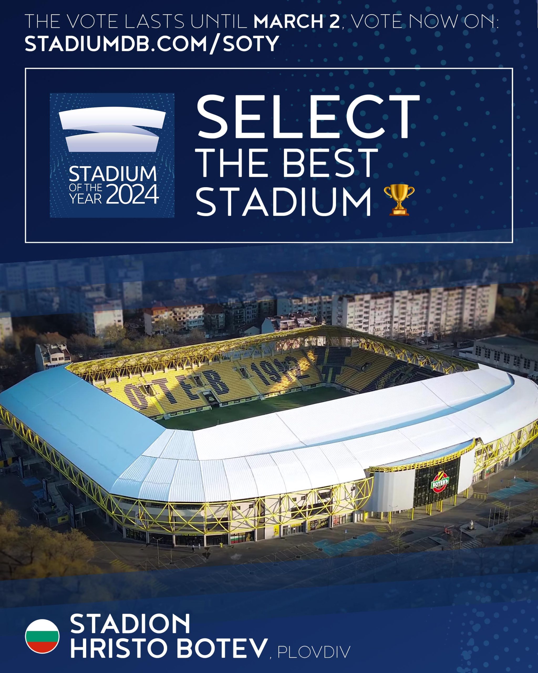 555 Обявиха старта на тазгодишния конкурс „Стадион на годината“, организиран от StadiumDB.com, като сред 23-те изключителни номинирани стадиона в света е и Стадион „Христо Ботев“, представящ Пловдив. Този конкурс е прекрасна възможност за общностите да се обединят около своите любими спортни съоръжения и да покажат своята гордост. Феновете могат да гласуват за до пет стадиона, като всеки глас има значение при определянето на победителя. Ще бъдем изключително благодарни, ако подкрепите инициативата, като споделите тази вълнуваща новина с вашата аудитория. Така ще вдъхновите повече хора да се включат и ще помогнете на Стадион „Христо Ботев“ да набере инерция в надпреварата. Тук да видите всички номинирани стадиони Резултатите от конкурса зависят изцяло от гласовете на публиката, което означава, че ангажираността на местните общности може да бъде решаващ фактор. Не винаги най-големият или най-скъпият стадион печели, а този с най-отдадените фенове. Вашата подкрепа в разпространението на тази информация може да окаже значително влияние и да помогне на Стадион „Христо Ботев“ да получи признанието, което заслужава. Платформа за гласуване в „Стадион на годината 2024“: http://stadiumdb.com/competitions/stadium_of_the_year_2024 Карта на всички номинирани стадиони: Инфографика „Как да гласуваме“: Може да ви хареса също Много футбол по телевизията в неделния ден Спортът по ТВ днес Грандиозна церемония по закриването на Олимпиадата – България отбелязва втория си най-успешен зимен старт Лора Христова и Милена Тодорова с добро представяне в масовия старт на 12,5 км на Зимните игри в Милано-Кортина