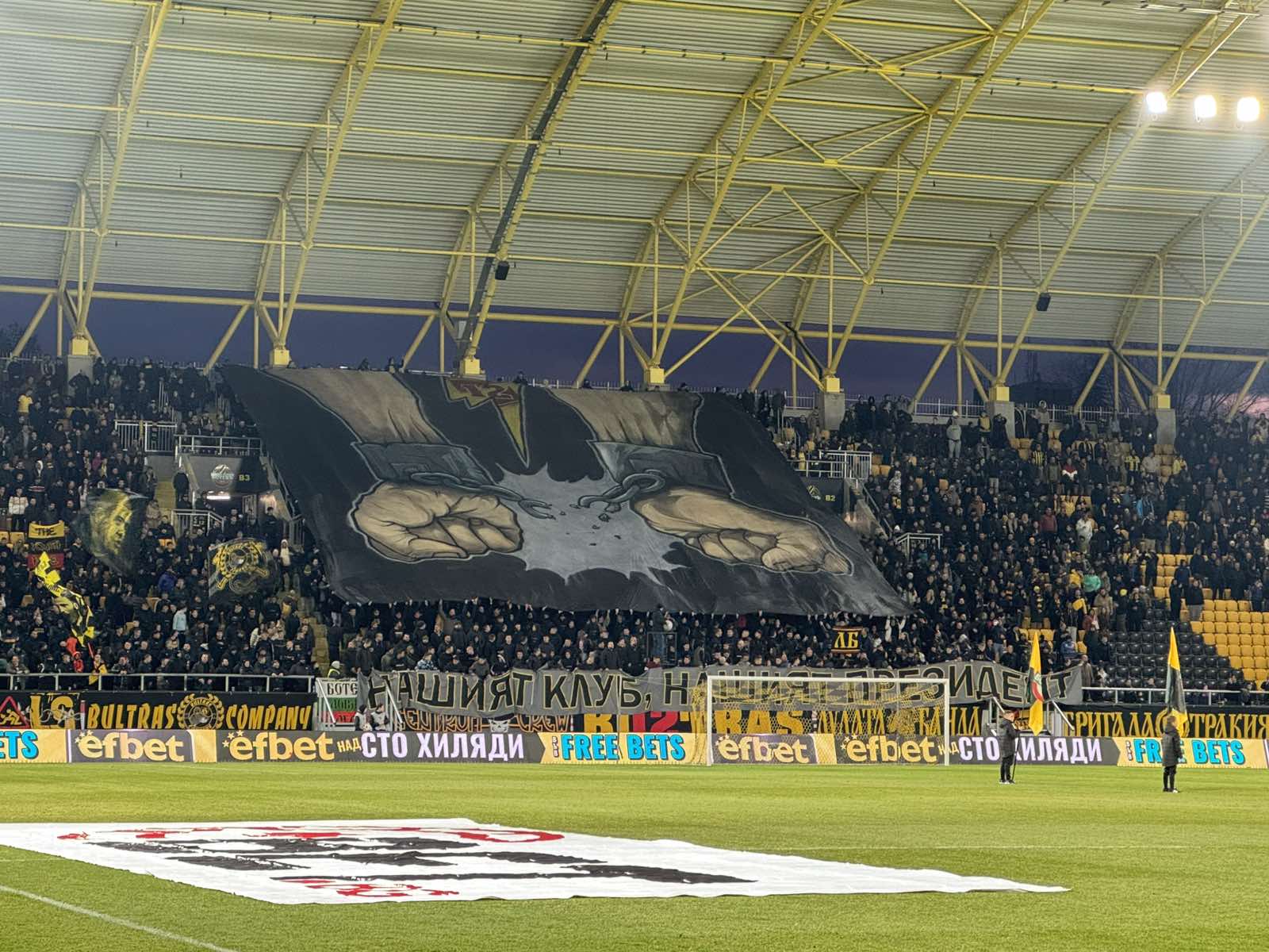 216 Отлична атмосфера създадоха феновете на Ботев преди началото на срещата с Лудогорец за Суперкупата. Преди първия съдийски сигнал на стадион „Христо Ботев“ прозвуча химна на България, а феновете станаха на крака, вдигайки специално приготвена хореография с българското знаме. Нвачукву пък използва мача, за да се сбогува с феновете след като бе продаден на Шефилд Юнайтед. В самото начало на мача бултрасите издигнаха и голям транспарант в подкрепа на Антон Зингаревич. Може да ви хареса също Спортът и мачовете по телевизията днес Ботев без Неделев и срещу Локо Сф Обявиха разбивките за жребия на Световното първенство по футбол В Ботев си спомниха за гола от центъра на Тодор Неделев