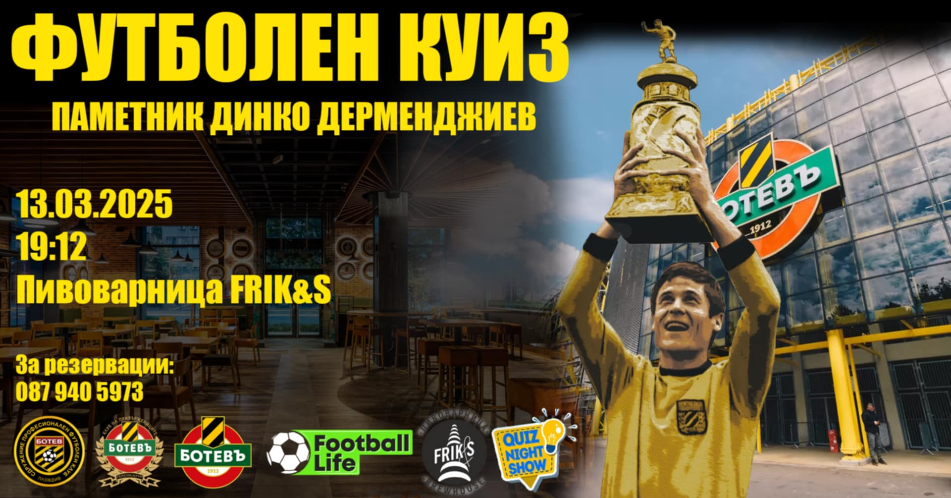 201 Клуб на привържениците на Ботев Пловдив и Сдружение ПФК Ботев ви канят на един малко по различен футболен куиз. „На 13.03 от 19:12 ч в бирария Frik&s @pivovarnitza съвместно с нашите приятели от Quiz Night Show Plovdiv и @footballlife.bg организираме благотворителен футболен куиз. Куизът ще се проведе със съдействието на Botev Plovdiv, а всички събрани средства ще бъдат дарени на Фондация „Жълто и Черно“ @foundation.yellow.black за изграждането на паметника на легендата Динко Дерменджиев – Чико“- съобщиха организаторите. За резервации – телефон 087 940 5873 Може да ви хареса също Краси Балъков с емоционален призив за Боби Михайлов и разкрития за помирението с Камата Спортна ТВ събота 16 от 16 за Марица в НВЛ след категоричен успех срещу ЦСКА Чешката полиция: Скиорът, блъснал Малена Замфирова, не е бил пиян