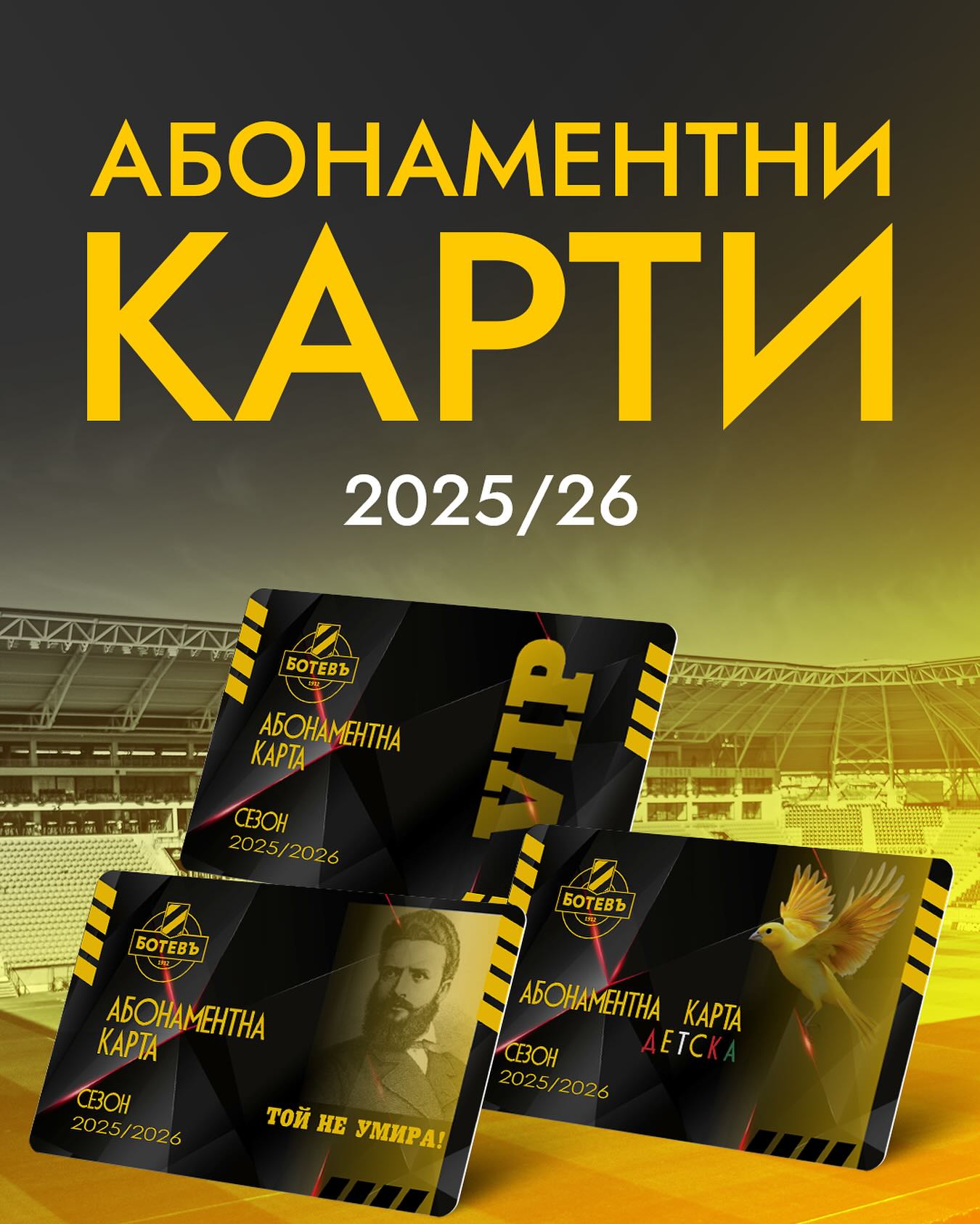 298 Ботев (Пловдив) стартира от сряда (02.07) в 10:00 часа продажбата на абонаментни карти за сезон 2025/26. Картите ще важат за всички домакински мачове на отбора в първенството и в турнира за Купата на България. Новото ръководство на ПФК Ботев Пловдив няма да се съобрази със заложеното увеличение на абонаментните карти и те ще останат на познатите до момента цени. В периода 02 юли – 11 юли (включително) всички притежатели на карти от изминалия сезон 24/25 ще могат да подновят абонамента си и да запазят своето място за идната кампания. Подновяването става след представяне на картата от миналия сезон. В утрешния ден ще стартира и масовата продажба на абонаментни карти за всички фенове, които до този момент не са имали такава. От 12 юли всички места, които не са подновени, ще бъдат налични за закупуване. Своите абонаментни карти ще можете да закупите от билетната каса на стадион „Христо Ботев“, намираща се откъм ул. “Богомил” (зад Трибуна Север). Работното време на касата е от 10:00 часа до 18:00 часа. Ето и цените на абонаментните карти: Трибуна Изток – 300 лв. Трибуна Юг – 220 лв. Трибуна Север – 220 лв. Централна трибуна: Блок 1, 2, 6, 7 – 390 лв. Блок 3, 5 – 530 лв. Блок 4 – 590 лв. Премиум 2 (с кетъринг) – 1 200 лв. Премиум 3 – 590 лв. Премиум 2 + допълнителен достъп до Lounge 1912 – 1912 лв. Отстъпки: 10% – за подновяване на абонаментна карта за сезон 2024/25 50% – за деца между 5 и 14 години (включително), както и пенсионери над 65 години и пенсионери по болест срещу предоставяне на документ, удостоверяващ това * Сезонните абонаменти за паркоместата на стадион „Христо Ботев“ ще бъдат налични на по-късен етап. Може да ви хареса също Билетите за „Мача на Надеждата“ вече са в продажба, част от средствата ще помогнат на Любо Пенев и Петър Хубчев Миха Търдан получи приза си за играч №1 на 27-мия кръг Ето как се представиха националите на Ботев Спортът и мачовете по телевизията днес