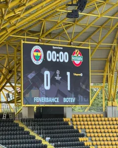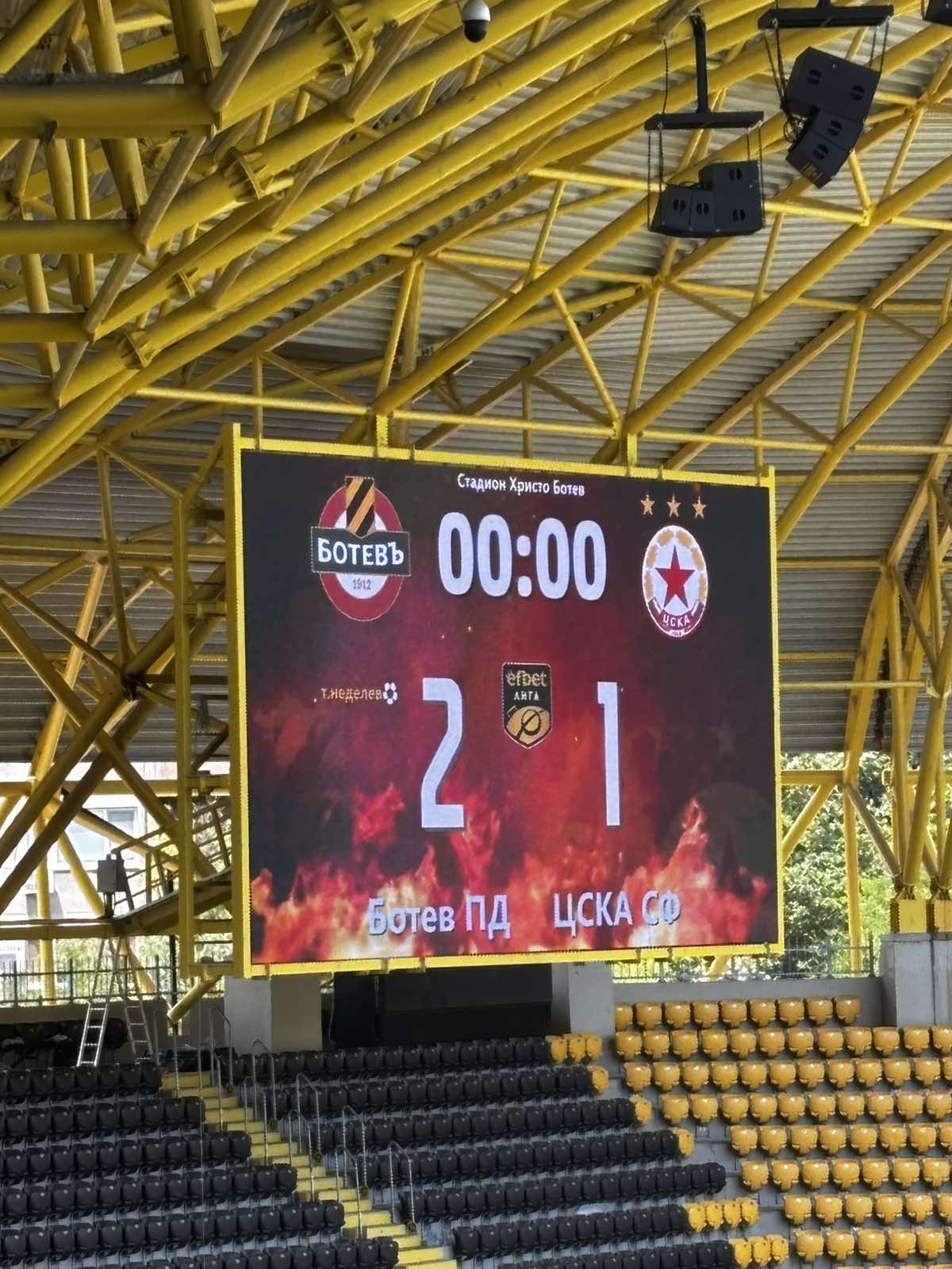 585 Ботев вече победи ЦСКА. Това гласи новото табло на стадион Христо Ботев. Според изписаното Ботев бие с 2:1, а попаденията за канарчетата са дело на Тодор Неделев. От няколко дни се правят тестове. Преди дни таблото показваше, че Фенербахче е домакин на Ботев на „Колежа“ в двубой от Шампионска лига и губи с 0:1 от „канарчетата“, а отново като голмайстор бе изписан Неделев. Може да ви хареса също ПФК Локомотив: Бъди на стадиона и подкрепи черно-белите! Битката и себераздаването за емблемата на Локомотив са гарантирани! Спортът и мачовете по телевизията днес Митко Илиев повдига настроението в Локо Обявиха съдията за дербито на Пловдив