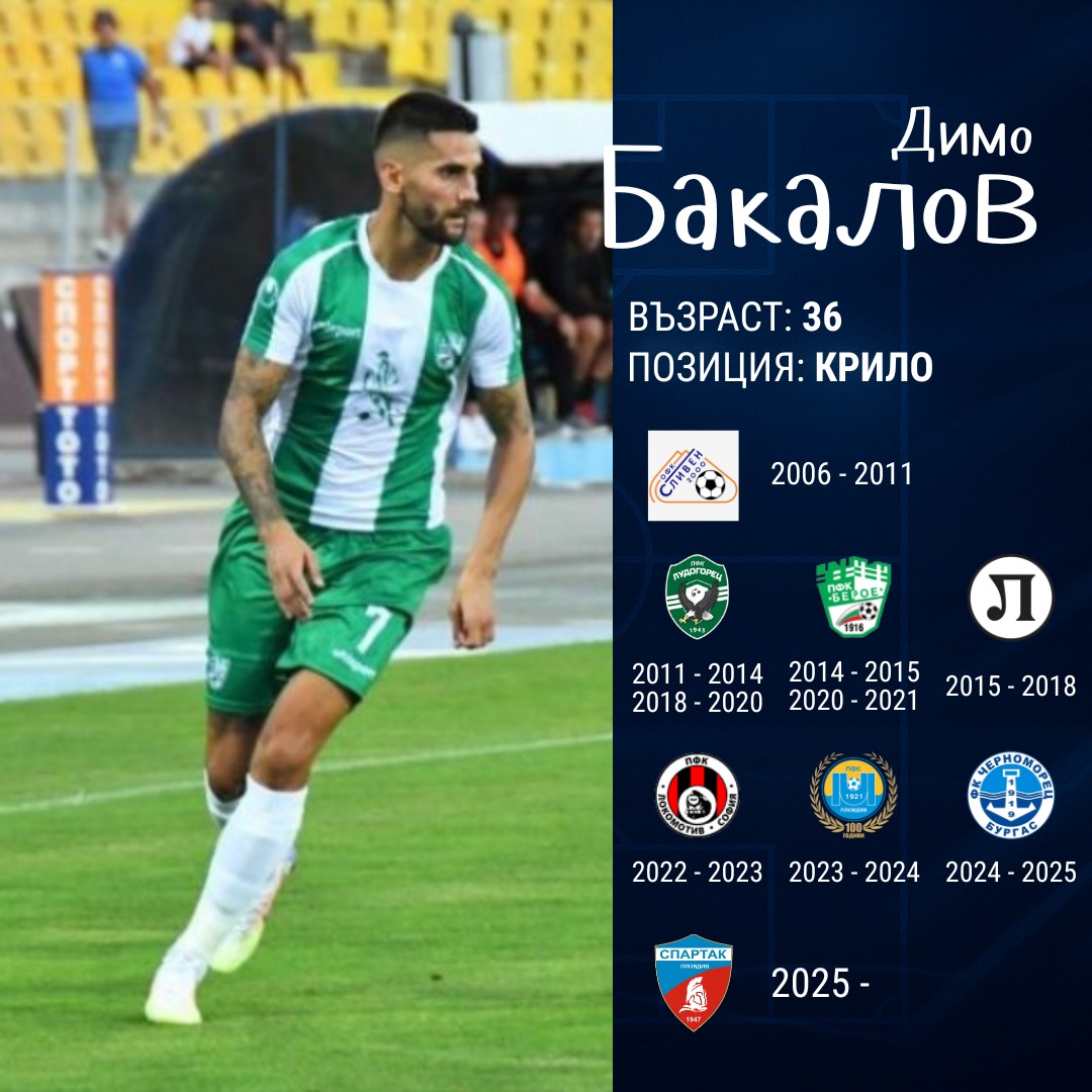 337 Димо Бакалов е най-новото име в състава на Спартак! Офанзивният футболист носи със себе си сериозен опит – в кариерата си е петкратен шампион на България и двукратен носител на Купата на България с Лудогорец. Играл е още за Берое, Локомотив (Пд), Локомотив (Сф), Марица и Черноморец (Бс). Добре дошъл в Синьо-бялото семейство, Димо!- написаха гладиаторите. Може да ви хареса също Локо тренира в отлично настроение преди полуфинала с Арда Над 27 милиона евро са одобрените средства от ММС за спортните федерации за 2026 година Спортът и мачовете по телевизията днес Застреляха футболен съдия по време на мач