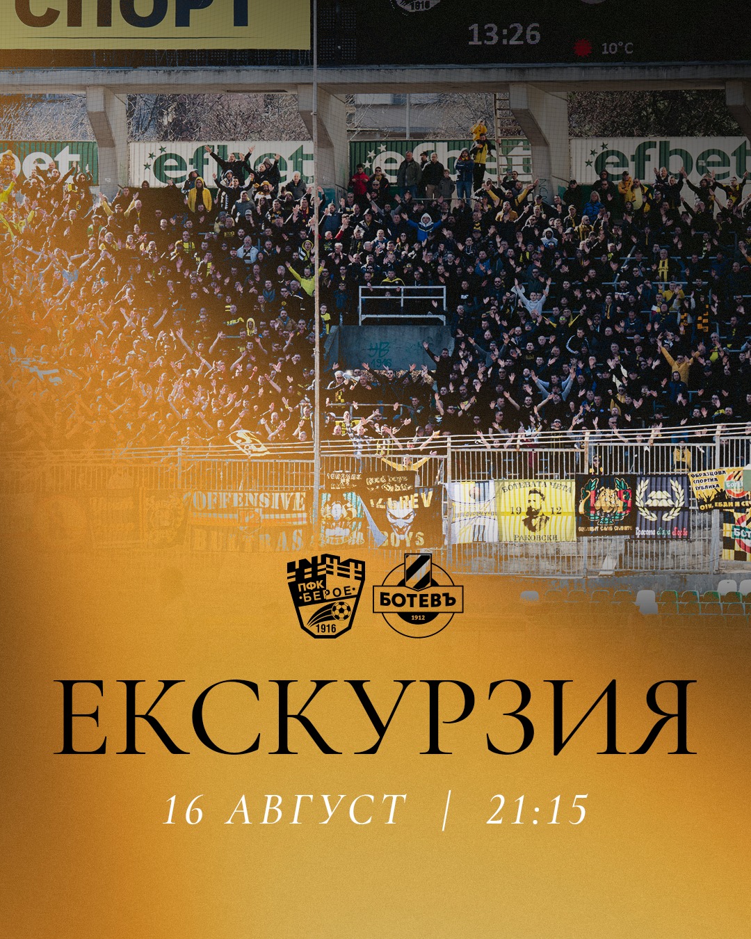 427 Ботев Пловдив организира екскурзия за феновете за предстоящото гостуване на Берое в Стара Загора. „Битката за Тракия“ е на 16 август от 21:15 часа на стадиона под Аязмото. Цената на екскурзията е 10 лева, като в нея не е включен билет за мача. Записванията ще се осъществяват във фен магазина на стадион „Христо Ботев“ от утре (вторник) до края на работния ден в петък. Автобусите ще отпътуват за Стара Загора в съботния ден около 18:00 часа от стадион „Христо Ботев“. Нека подкрепим любимия „жълто-черен“ отбор в трудния момент! Заедно сме по-силни!- призоваха от Ботев. Може да ви хареса също Феновете на Локо плащат по 10 евро в Стара Загора Шофьор без крака блъсна четирима, трима в тежко състояние Много футбол по ТВ днес Спортна ТВ неделя