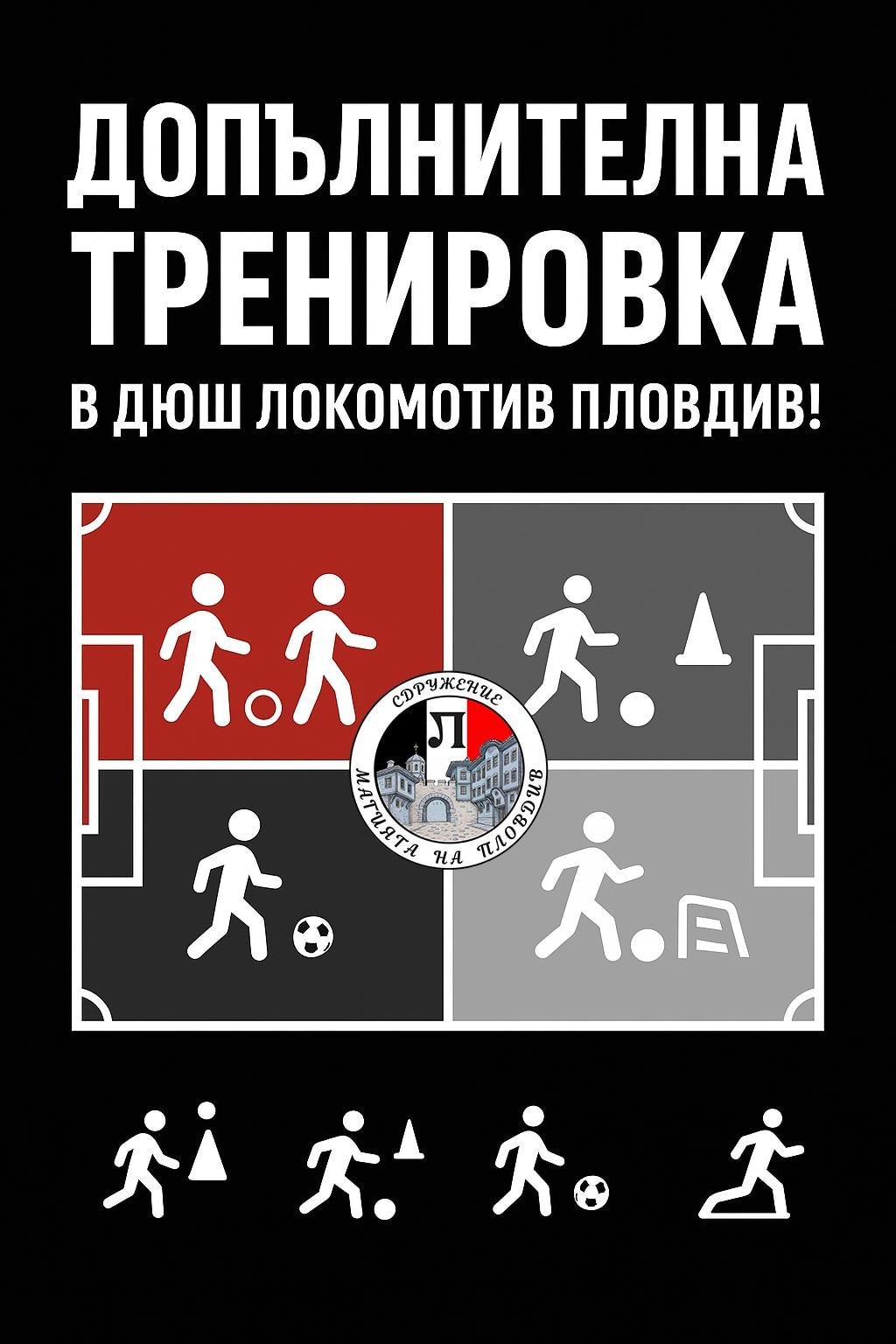 266 Допълнителна тренировка в ДЮШ Локомотив Пловдив Подсигурена изцяло от Сдружение „Магията на Пловдив“ Започваме още тази седмица! Децата ще тренират заедно – в един ден и един час – на големия терен, разделен на 4 зони! Всяка зона ще бъде водена от различен треньор, а децата ще се редуват и ще преминават през всички упражнения: 1️ 1:1 дуели 2️ Скорост и експлозивност 3️ Ball Mastery (техники и контрол над топката) 4️ Завършващ удар Всяка станция: 15–20 минути пълна концентрация, дисциплина и забавление! Място: Стадион „Локомотив“ Дата и час на първа тренировка: 20 август, 19:30 ч. Цел: Да развием всички ключови елементи от футболната игра в една динамична и забавна тренировка! Очакваме ви! Само Локо!- написаха организаторите от Сдружение „Магията на Пловдив“ Тренировката е пожелателна и безплатна за децата от набор 2018, 2017, 2016 и 2015 в ДЮШ Локомотив Пловдив. Ако имате възможност и желание да се включите с помощ към децата на Пловдив, които обичат спорта – нека заедно ги направим успешни спортисти- призоваха още от Сдружението. Банкова сметка за спонсорства и дарения: IBAN: BG62 IABG 7095 1001 3466 01 Титуляр: Сдружение „Магията на Пловдив“ Основание: Спонсорство за развитието на ДЮШ Контакти: 📧 tmoplovdiv@gmail.com 📱 0879 555 291 Може да ви хареса също Фенклуб Локомотив Пловдив: Гаранции за готов стадион до септември и юбилей пред публика Крушарски: Сам не си говоря, интерес към Локо има само от мен Спортът и мачовете по телевизията днес БФС вдига глобите за следващия сезон
