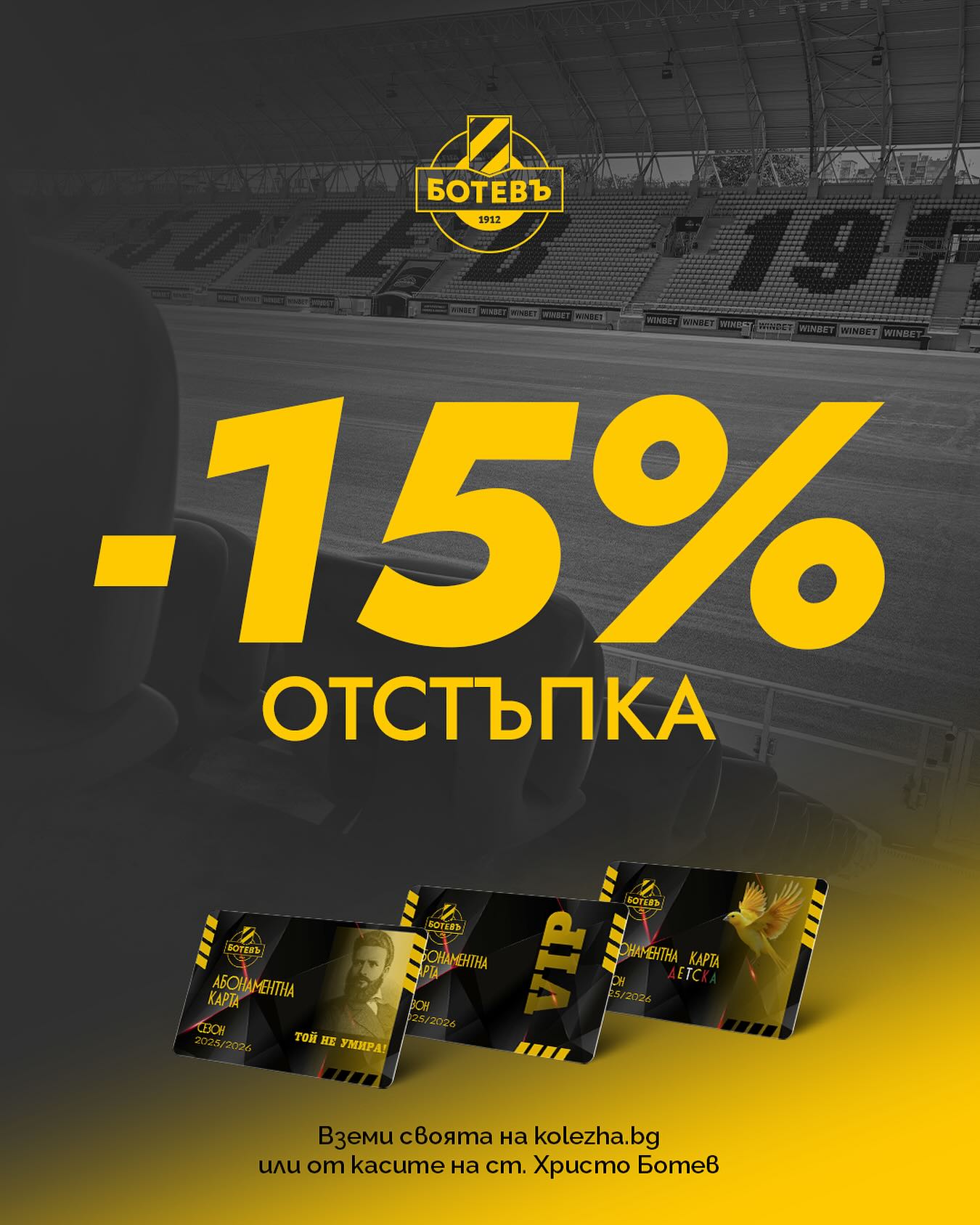 235 Ботев Пловдив обявява допълнителни 15% отстъпка на всички абонаментни карти за сезон 2025/26. Всеки, който желае да вземе от пластиките за стадион “Христо Ботев”, може да се сдобие с тях в клубния магазин на “Колежа”, както и онлайн на kolezha.bg. До момента 2695 ботевисти закупиха абонаментни карти за най-красивия стадион в България. Ето и новите цени на абонаментните карти: Трибуна Изток – 255 лв. Трибуна Юг – 187 лв. Трибуна Север – 187 лв. Централна трибуна: Блок 1, 2, 6, 7 – 332 лв. Блок 3, 5 – 450 лв. Блок 4 – 502 лв. Премиум 2 (с кетъринг) – 1 020 лв. Премиум 3 – 502 лв. Премиум 2 + допълнителен достъп до Lounge 1912 – 1625 лв. Може да ви хареса също Обявиха Стоичков за най-великия футболист на България, Гунди и Бербатов допълват тройката Подготовката на Локо за визитата на Берое върви по план! Константинос Балоянис записа мач №100 с екипа на Ботев Пловдив! Зума и Живко Миланов дадоха пари за спасението на кипърски гранд