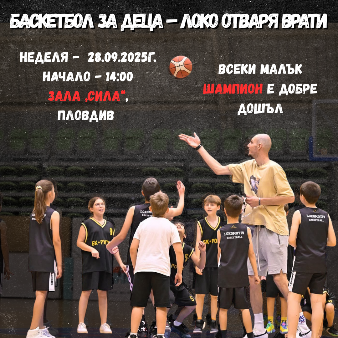 177 Баскетболен клуб Локомотив Пловдив кани всички деца и техните семейства на специален празник – „Ден на баскетболните герои“. Събитието ще се проведе в неделя, 28 септември 2025 г., след 14:00 ч. в зала „Сила“, гр. Пловдив. В рамките на следобеда залата ще се изпълни със смях, игри и спортен дух. Малките шампиони ще имат възможност да се включат в баскетболни забавления, да се запознаят с играчите от мъжкия отбор на Локомотив Пловдив и да тренират рамо до рамо с треньорите от Детско-юношеската школа. Инициативата има за цел да вдъхнови децата, да насърчи любовта им към спорта и да ги направи част от голямото баскетболно семейство на Локомотив Пловдив. Очакват ги нови приятелства, незабравими емоции и атмосфера, която ще помнят дълго. Дата: неделя, 28 септември 2025 г. Начало: 14:00 ч. Място: зала „Сила“, гр. Пловдив Всеки малък шампион е добре дошъл – защото топката зове, а баскетболът е за всички!- призоваха от БК Локомотив. Може да ви хареса също В Словения: Душан Косич води Локо Пд към Европа Спортна ТВ събота Локо покори Пловдив, отдалечи Академик от плейофите Марица е на финал! Шампионките елиминираха ЦСКА и ще играят за титлата в НВЛ