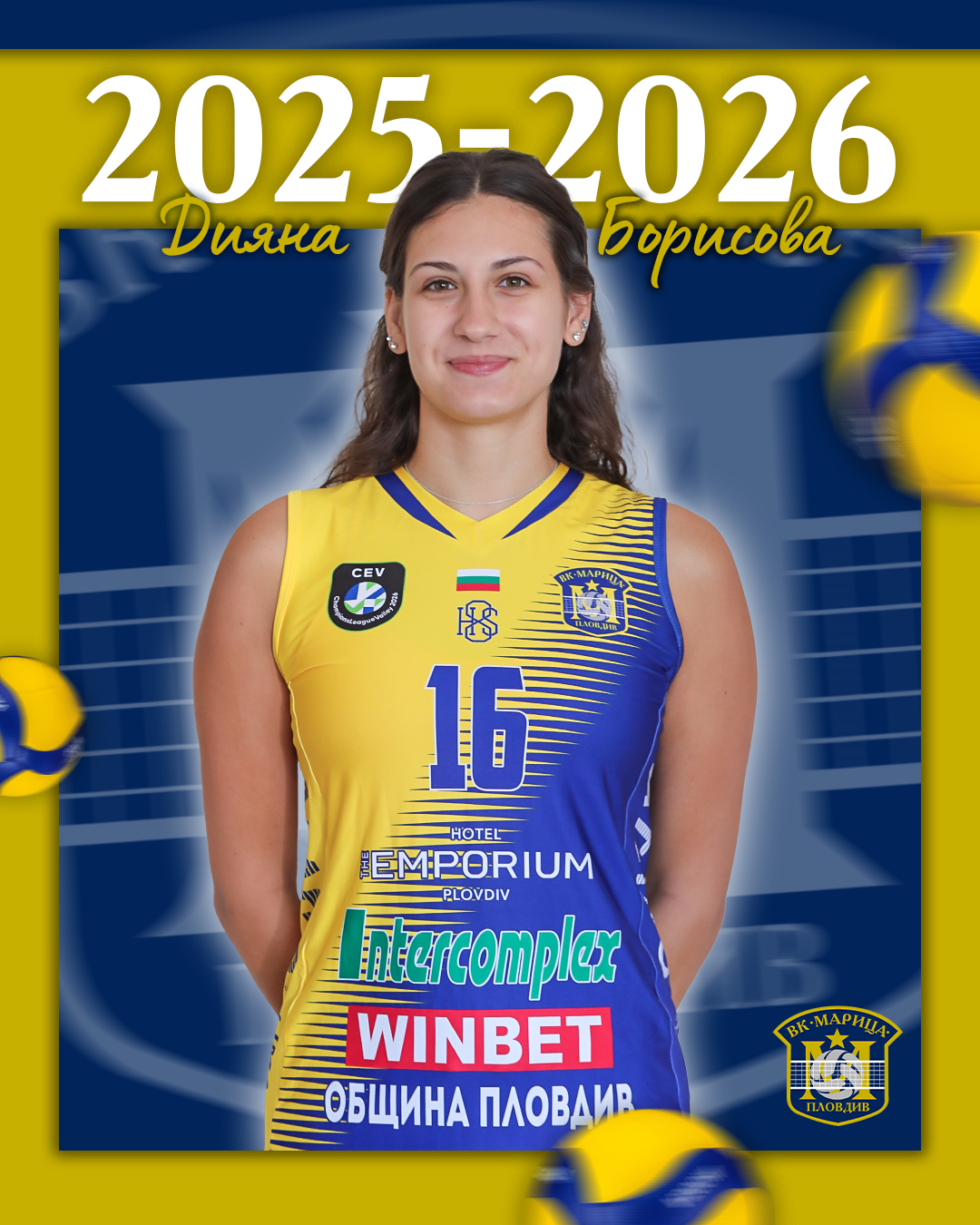 203 Посрещачката Дияна Борисова ще защитава цветовете на Марица и през сезон 2025–2026! Продукт на школата на клуба, Дияна започва своя втори сезон с шампионките, като има титла и Купа в актива си, както и принос към историческия успех на Марица – преминаване на груповата фаза на Шампионската лига за първи път в клубната история. Младата волейболистка има четири титли с девойките старша възраст на Марица и е част от националните гарнитури на България, като с отбора до 16 години завоюва бронз от Европейското първенство през 2021 г., година по-късно печели сребро от Балканиадата до 17 години, а това лято завоюва почетното четвърто място на Световното първенство до 21 години. От Марица пожелаха на Диди нови върхове с жълто-сините през новия сезон! Може да ви хареса също Тим „Киселаров“ превзе тежката категория в бокса Гришо срещу испански квалификант на старта на турнира от сериите „Чаланджър 175“ в Екс-ан-Прованс ПФК Локомотив към феновете си: Нека заедно да извървим последната крачка по пътя към финала! БФС пак одруса Ботев
