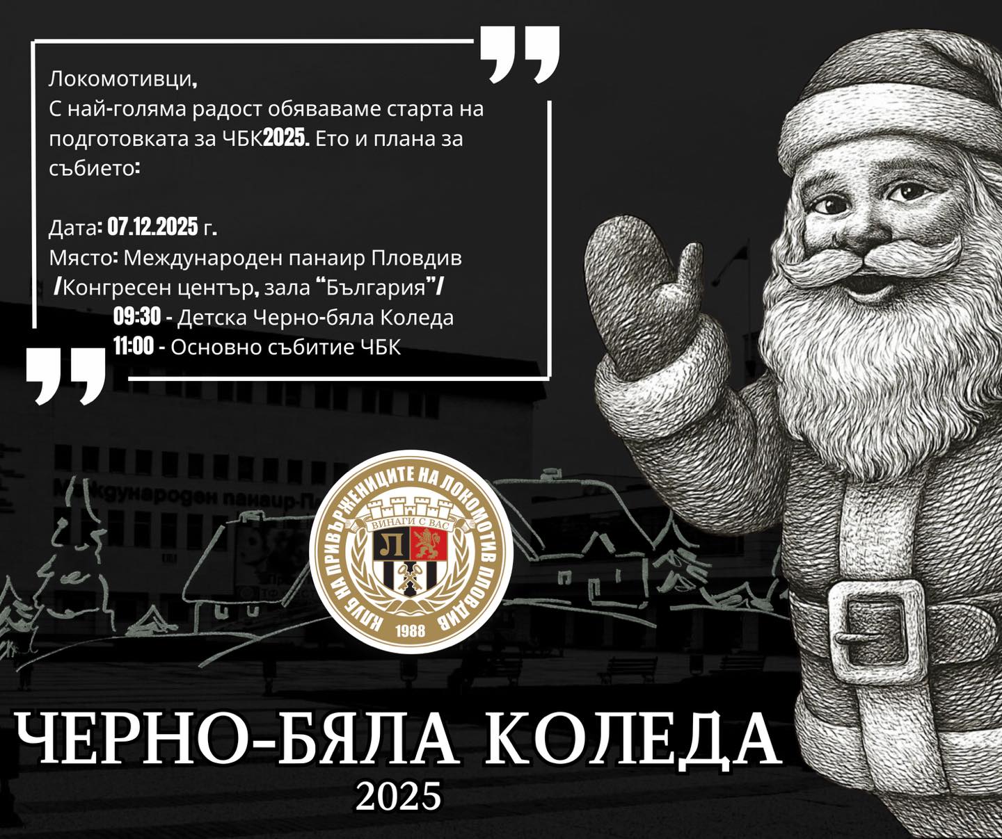 25 Фенклуб Локомотив обяви Черно- бяла Коледа 2025: Черно-бели братя и сестри, В навечерието на най-светлите празници, футболен Пловдив отново се подготвя за своя най-емоционален ден – Черно-бялата Коледа! На 7 декември 2025 г. традицията ще срещне страстта, а черно-бялата магия отново ще обедини всички, които носят Локомотив в сърцето си. От 11:00 часа отваряме вратите за голямото събитие, което всяка година събира поколения „черно-бели“ – от ветераните до най-малките ни фенове. Ще си припомним славни мигове, ще аплодираме героите на сезона и ще отличим футболиста на годината, най-красивия гол и нашите шампиони в другите спортове. Както винаги, ще има емоции, музика, изненади. Място: Панаир Пловдив – зала „България“ Начало: 11:00 ч. Елате да отпразнуваме заедно края на още една година, изпълнена с гордост, любов и вярност към отбора! Може да ви хареса също Александър Димитров обяви пълния списък за Турция и Грузия Паметна дата в историята на Ботев! На този ден канарчетата бият Байерн Мюнхен Спортът и мачовете по телевизията днес Никола Илиев излиза за мач №50 в професионалния футбол с екипа на Ботев