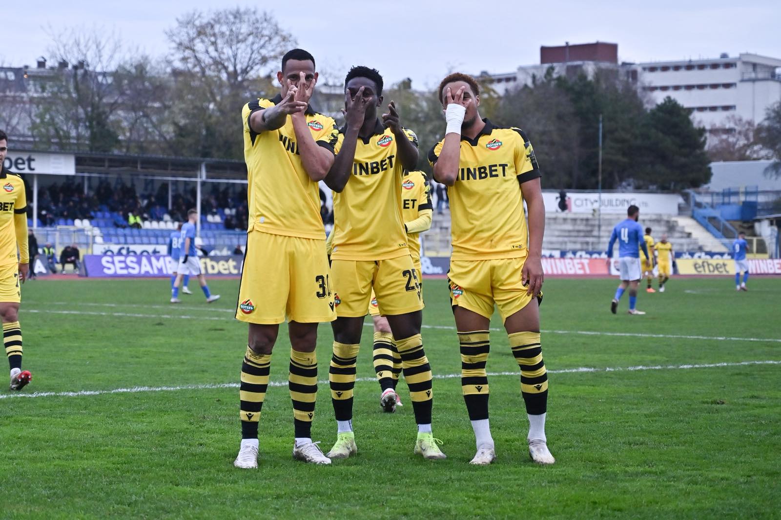 70 Ботев Пловдив победи с 2:0 Спартак Варна и продължава напред към 1/4 финалите за Купата на България. Жълто- черните си решиха мача още през първото полувреме с два безответни гола. Преди началото на двубоя футболистите на Ботев излязоха със специални фланелки в подкрепа на Любослав Пенев, който се бори с тежък здравословен проблем. Още в началните минути „жълто-черните“ бяха по-активни. Армстронг Око-Флекс отправи няколко удара към вратата, а в 30-ата минута логичното се случи. След балонно центриране Око-Флекс се справи сам с двама защитници на „соколите“, нахлу в наказателното поле и с точен удар с левия крак откри резултата – 1:0 за Ботев Пд. Преди това пловдивчани пропуснаха още няколко възможности чрез Тодор Неделев и Луис Пахама, докато вратарят на Спартак Илия Шаламанов се отличи с няколко сигурни намеси. В 39-ата минута Ботев удвои аванса си. Балоянис отправи мощен удар от дистанция, Шаламанов изби, но топката попадна у Франклин Маскоте, който бе най-съобразителен и отблизо реализира за 2:0. След почивката Спартак Варна заигра по-активно, но така и не стигна до нещо опасно пред вратата на Наумов. В 70-ата минута Шаламанов отново спаси вратата си след опасен удар на Димитър Митков. Така след трудното начало на сезона, Ботев приключи по чудесен начин календарната година и с надежда за добра подготовка и силен пролетен полусезон. Може да ви хареса също Ботев ще прегърне… Киселичков: Имаме отлични условия за работа на високо европейско ниво, приляга ни различно поведение като игра и като резултати Тодор Неделев: Купата е една от нашите цели, ще гоним и по- добро класиране в първенството Ето ги съставите на Спартак и Ботев