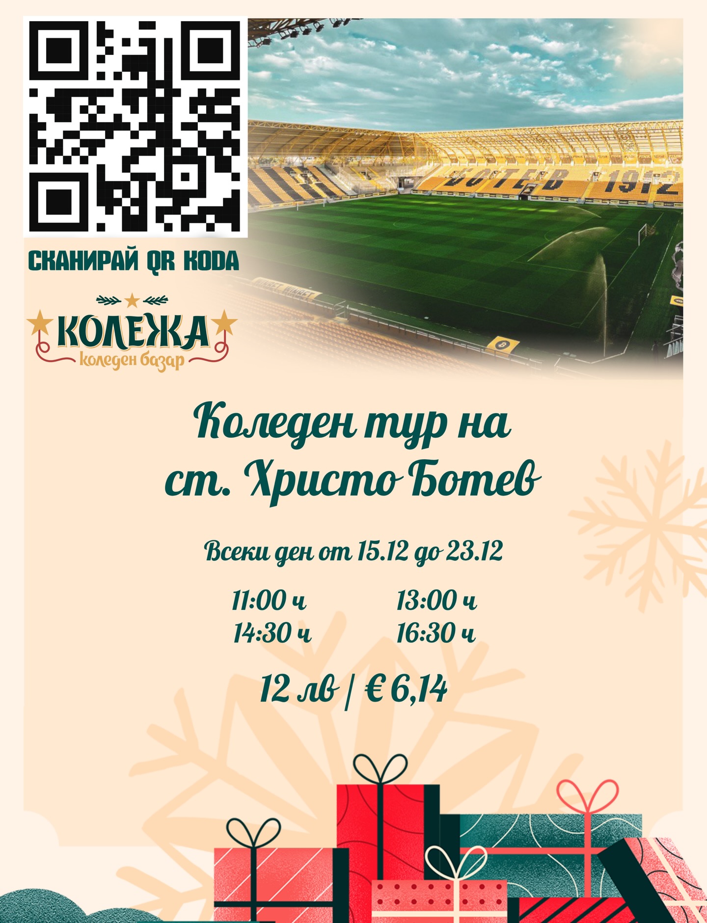 321 Ботев Пловдив организира коледен тур на стадион “Христо Ботев”. Всички ботевисти и гости на нашия град ще могат да надникнат в най-красивия стадион на България. Множеството привлекателни скайбоксове, най-добрите места на трибуните и съблекалнята са само част от местата, до които ще имате достъп. Запишете се на kolezha.bg. Може да ви хареса също БФС прибира закъсали българи от Джакарта Ясно е по коя БГ телевизия ще дават Мондиал 2026 Ботев 2012 си тръгна с успеха от Пловдив след кошмарен мач за Локомотив Ела и подкрепи лъвчетата на стадион „Христо Ботев“!