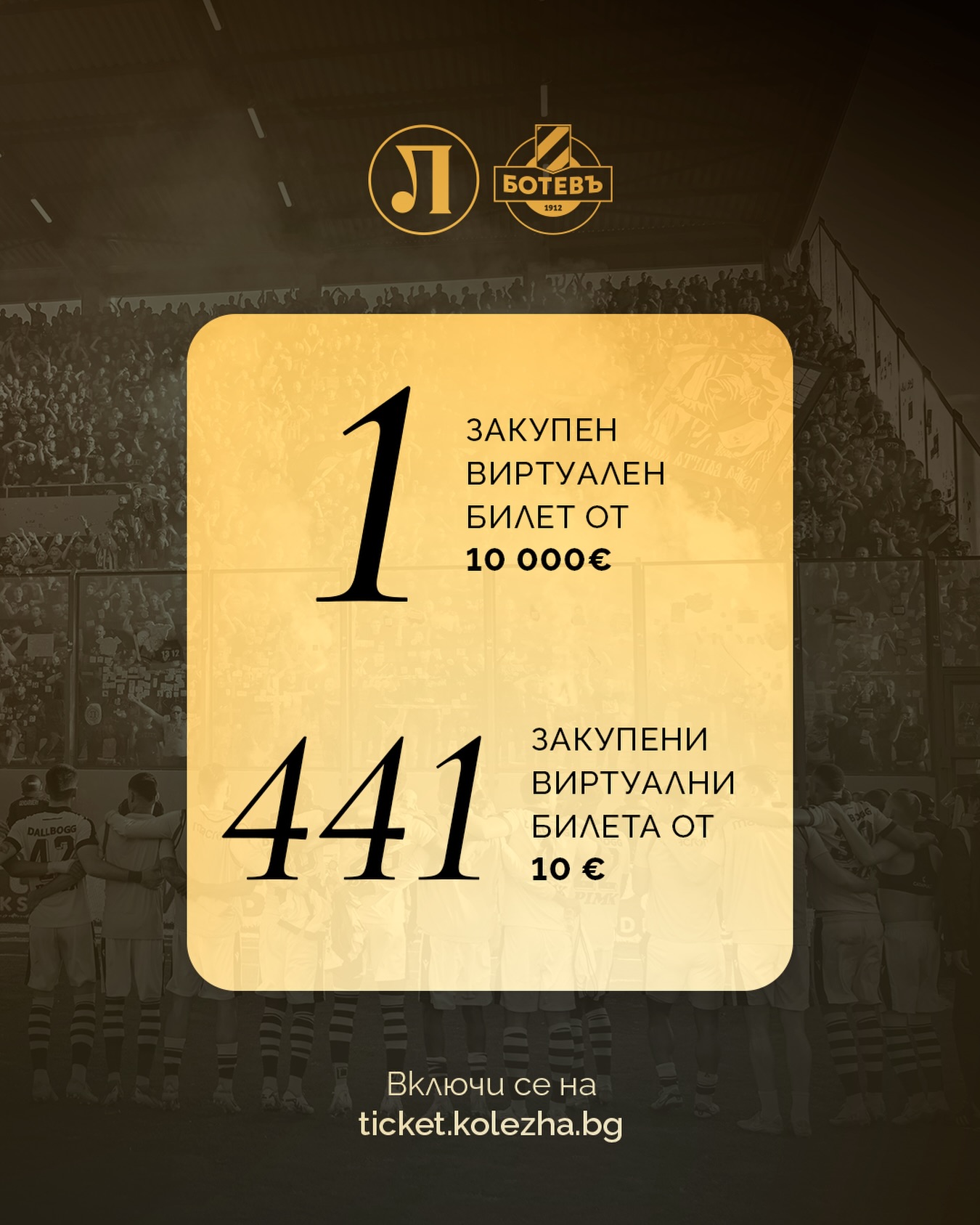 114 Остават броени часове до края на кампанията с виртуални билети за дербито с Локомотив! 1 билет на стойност 10 000 евро 441 билета по 10 евро Всички събрани средства ще бъдат предоставени като премия на отбора при класиране на полуфинала! Кампанията продължава до 15:00 часа на утрешния ден. Включи се и ти на kolezha.bg– призоваха от Ботев. Може да ви хареса също Каталин Иту все по- близо до Левски Спортът и мачовете по телевизията днес Марица ще играе контрола с Хасково Локо Пд търси спешно нов ляв бек