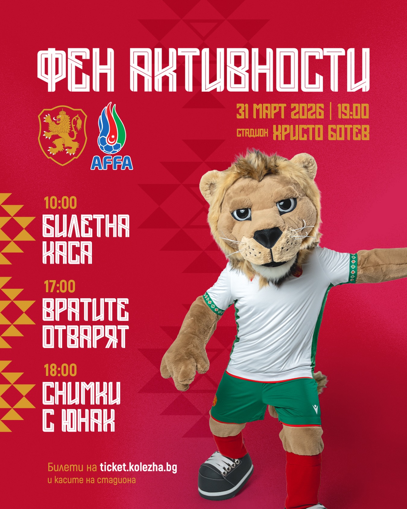 10 Този вторник, 31 март, България U21 приема Азербайджан U21 на стадион „Христо Ботев“ в Пловдив от 19:00 ч. Билетната каса отваря в 10:00 ч. в деня на мача. Вратите на стадиона отварят в 17:00 ч. От 18:00 ч. ще имате възможност да се запознаете и снимате с Юнак – талисмана на националния отбор. Билети можете да закупите още сега онлайн оттук: kolezha.bg Ела и подкрепи лъвчетата! Може да ви хареса също Ясно е по коя БГ телевизия ще дават Мондиал 2026 Ботев 2012 си тръгна с успеха от Пловдив след кошмарен мач за Локомотив Иван Иванов с втора титла при мъжете: Българинът спечели турнир в Испания Стоичков със силни думи за юбилея на Красимир Балъков