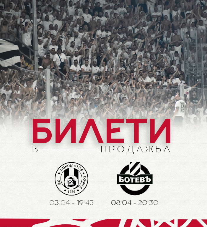 191 Локомотив Пловдив пусна билетите за Локомотив (София) и Ботев (Пловдив)! Пропуските за „железничарското“ дерби са в продажба от понеделник онлайн и в партньорската мрежа на Ивентим – бензиностанции OMV, магазини Технополис, книжарници Orange, магазини Office1Superstore и касата пред сградата на Община Пловдив, а касите на „Лаута“ ще работят в петък от 10:00 часа до края на първото полувреме. Цени от 10 и 15 евро. Пропуските за дербито с Ботев ще се продават само на „Лаута“. От домакините са отпуснали общо 1800 билета на цена от 10 евро. Ето от къде можете да си закупите пропуски за дербито в следващите три дена: 1. Официален магазин на клуба 01.04 – от 9:30 до 12:30 и от 13:00 до 17:00 часа 02.04 – от 9:30 до 12:30 и от 13:00 до 17:00 часа 03.04 – от 9:30 до 12:30 и от 13:00 до 17:00 часа 2. Фен магазин 01.04 – от 11:30 часа до 18:00 часа 02.04 – от 11:30 часа до 18:00 часа 03.04 – от 11:30 часа до 18:00 часа 3. Каса 1 03.04 – от 10:00 часа до 20:15 часа Може да ви хареса също България U16 с втори успех в Турнира за развитие на УЕФА Неделев към феновете на Ботев: Елатe и ни подкрепете, ние ще се постараем да ви зарадваме с една хубава победа Илиян Филипов каза на кой мач на Ботев е плакал и кой е най- великия футболист на жълто- черните Локо тренира в отлично настроение за дербито