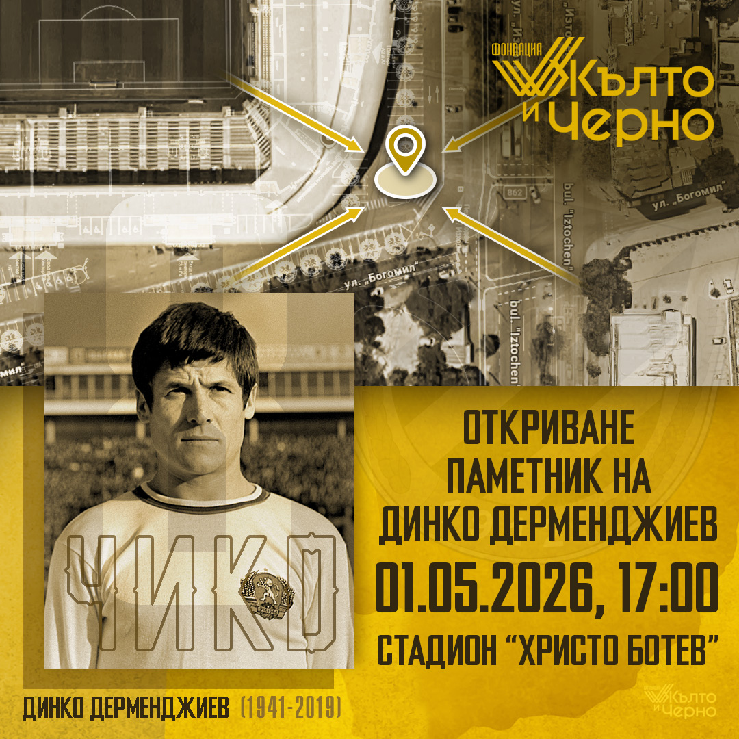155 Паметникът на легендарния Динко Дерменджиев – Чико ще бъде тържествено открит на 1 май от 17.00 пред стадион „Христо Ботев“. Ето какво съобщиха от Фондация Жълто и Черно: С огромно вълнение, нетърпение и удоволствие ви съобщаваме, че паметникът на легендарния Динко Дерменджиев – Чико ще бъде тържествено открит на 1 май от 17.00 пред стадион „Христо Ботев“. В качеството си на инициатор на кампанията за изграждането на паметник на незабравимия Динко Дерменджиев, както и като организатор на предстоящото събитие, „Фондация Жълто и Черно“ кани най-учтиво пловдивското гражданство на това паметно за града ни събитие. На 1 май ще почетем една вечна спортна легенда! На 1 май клубните пристрастия няма да имат никакво значение! Вземете семействата си, децата си, съберете се с приятели и елате да отдадем дължимото на една от най-ярките фигури в спортния живот на България! Защото Чико радваше не само „жълто-черното“ семейство! Той беше обичан от цяла България! 01.05.2026 година, 17.00 часа, стадион „Христо Ботев“! Бъди част от историята! С уважение, Фондация „Фондация Жълто и Черно“ Може да ви хареса също Родни и чужденстранни тимове следят вратаря на Локо Григор Димитров отпадна в първия кръг на турнира от сериите „Мастърс 1000“ в Мадрид Локо пусна видео с избрани моменти от разгрома над Арда в Кърджали От Арис отрекоха за интерес към Николай Минков