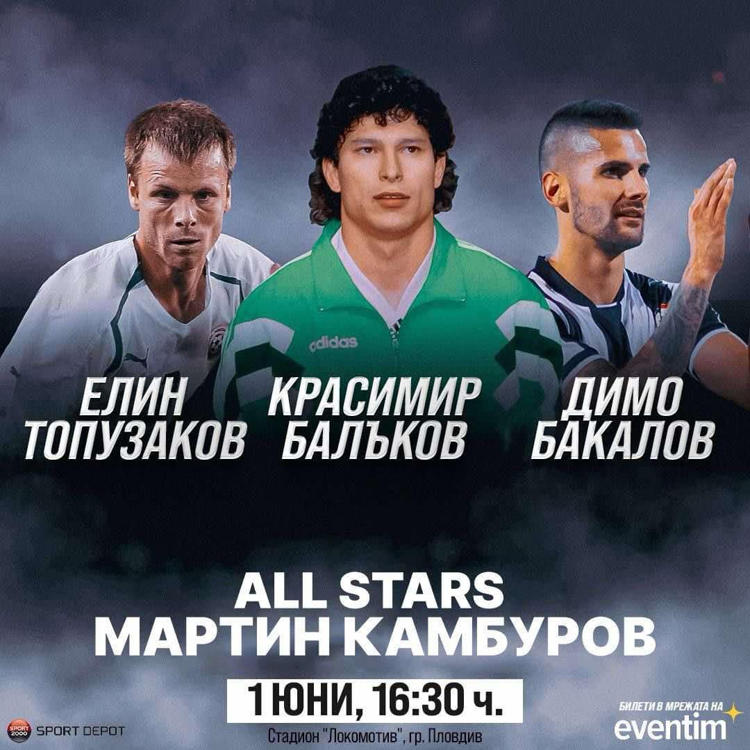 310 Още имена ще вземат участие в бенефиса на Мартин Камбуров на 1 юни в 16:30 часа на стадион „Локомотив“ в Пловдив. Красимир Балъков – отбор ALL STARS Bulgaria с треньор Александър Томаш. Магичният плеймейкър бе с ключова роля за четвъртото място на България от Мондиала САЩ’94. Неслучайно Бала влезе в идеалния състав на турнира. Като футболист оставя трайна следа с екипите на родния Етър, Спортинг (Лисабон) и Щутгарт, печелейки Купата и Суперкупата на Португалия (1995), както и Купата на Германия (1997). С „швабите“ достига и финал за КНК през 1998 г и печели два пъти летния турнир на УЕФА Интертото. Елин Топузаков – отбор ALL STARS Bulgaria. Бивш национал на България с 29 мача за „трикольорите“ и истинска емблема на Левски, където играе цели 12 години. Със „сините“ сърцатият защитник става 5 пъти шампион на България, печели 6 национални купи и още 3 Суперкупи на страната и играе в груповата фаза на Шампионската лига (2006). Има също и два престоя в Израел. Димо Бакалов – отбор ALL STARS Lokomotiv с треньор Христо Бонев. Бързоногото крило записва 80 шампионатни мача с 16 гола за Локомотив (Пловдив) в периода 2015-2018 г. Преди и след това е част от Лудогорец, с който печели 5 шампионски титли, две национални купи и четири Суперкупи на България. Тримата се присъединяват към елитната компания на Стилиян Петров, Валери Божинов, Иван Иванов, Ивайло Чочев, Красимир Димитров и Ванчо Троянов, които също ще уважат дългоочакваното събитие. „Най-добрите места на стадиона се изкупуват с бързи темпове! Напомняме, че местата, посочени на пропуските, ще се спазват!“, напомниха от Локомотив Пловдив. „Не пропускайте да разберете кои ще са следващите три звезди! Харесайте страницата на Фондация „100 години Локомотив Пловдив“ и научете първи кои са те.“, призоваха още от черно- белите. Може да ви хареса също Ботев предложи нов договор на Константинос Балоянис Жестоко наказание за Душан Керкез в Гърция Първата крачка към титлата е направена: Марица надигра Левски в първия двубой от финалния плейоф Григор Димитров: Нямам какво да доказвам на никого