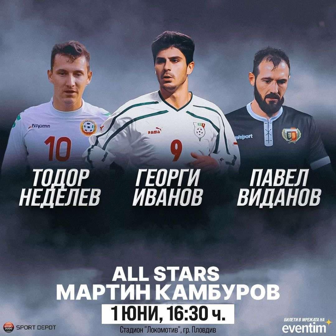 376 Следващите имена, които ще вземат участие в бенефиса на Мартин Камбуров, ще ви очакват на 1 юни в 16:30 часа на стадион „Локомотив“ в Пловдив: Георги Иванов – отбор ALL STARS Bulgaria. Тодор Неделев – отбор ALL STARS Bulgaria.️ Павел Виданов – отбор ALL STARS Lokomotiv. Тримата се присъединяват към елитната компания на Стилиян Петров, Валери Божинов, Елин Топузаков, Иван Иванов, Ивайло Чочев, Красимир Балъков, Димо Бакалов, Красимир Димитров и Ванчо Траянов, които също ще уважат дългоочакваното събитие. Най-добрите места на стадиона се изкупуват с бързи темпове! Напомняме, че местата, посочени на пропуските, ще се спазват! Билети за шоу мача в сайта на EVENTIM.bg 👉 https://bit.ly/all-stars-kamburov, билетен център на EVENTIM пред сградата на Община Пловдив, информационен център „Старинен Пловдив“, бензиностанции OMV и книжарници Orange в цялата страна и Фен магазина на стадион „Локомотив“. Може да ви хареса също Ботев предложи нов договор на Константинос Балоянис Жестоко наказание за Душан Керкез в Гърция Първата крачка към титлата е направена: Марица надигра Левски в първия двубой от финалния плейоф Григор Димитров: Нямам какво да доказвам на никого