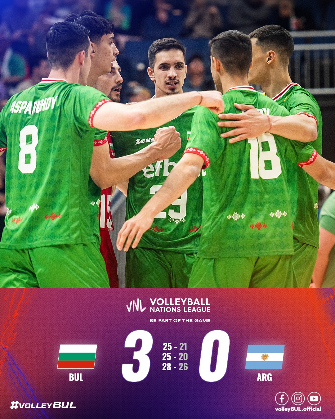 391 Волейболистите от националния отбор на България записаха страхотна първа победа в тазгодишната Лига на нациите. Момчетата на селекционера Джанлоренцо Бленджини надиграха категорично Аржентина с 3:0 (25:21, 25:20, 28:26) във втората си среща от турнира в Група 1 на Лигата, играна тази вечер в зала „Сентър Видеотрон“ в Квебек (Канада). Така българските „лъвове“ постигнаха първа победа над Аржентина от 2018-а година насам, като имат 1 победа, 1 загуба и 3 точки във временното общо класиране на комерсиалната надпревара. Южноамериканците са с 2 победи, 1 загуба и 5 точки в актива си. Следващият мач на България е срещу Германия утре (15 юни) от 03,00 часа българско време през нощта. Последният двубой на Аржентина пък е срещу световния шампион Италия също в неделя, но от 18,00 часа. Може да ви хареса също Юноши трнират с Локо преди мача с Монтана за Купата БЛС настоява за изменения в проекта на Закона за бюджета на НЗОК за 2026 г. Женският национален отбор по футбол ще има нов селекционер Президентът на БФС Георги Иванов приветства футболните легенди на традиционния Коледен обяд на ветераните